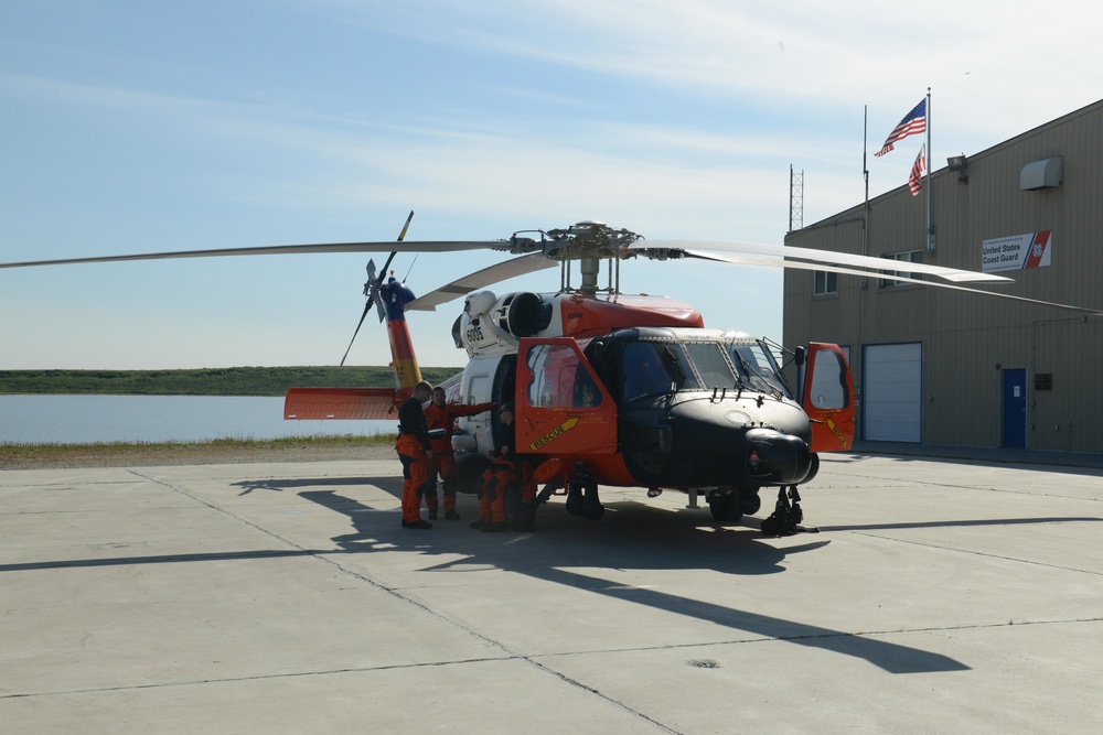 A Coast Guard Air Station Kodiak MH-60 Jayhawk aircrew, deployed to forward operating location Kotzebue, Alaska, conducts a pre-flight brief before flying a mission to Point Lay, July 13, 2017. FOL Kotzebue houses two Air Station Kodiak MH-60 Jayhawk helicopters and crews in support of Operation Arctic Shield. U.S. Coast Guard photo by Lt. Brian Dykens.