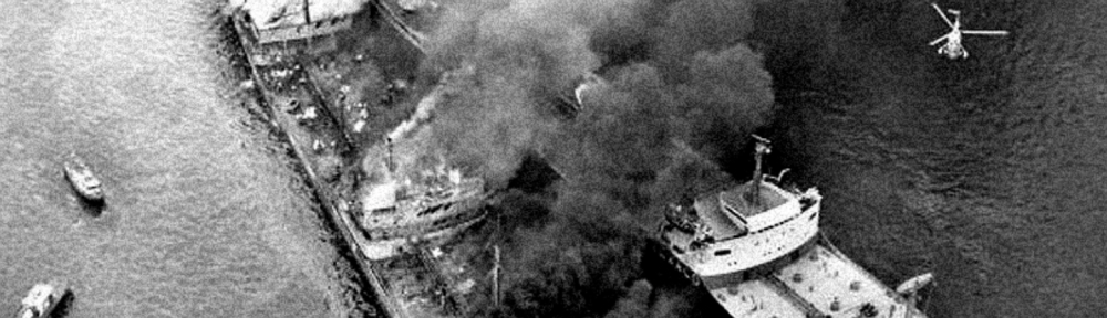 The Alva Cape (left) and Texaco Massachusetts afire with rescue craft and a US Coast Guard HH-52 Seaguard overhead. Original pic is courtesy of the NY Daily News