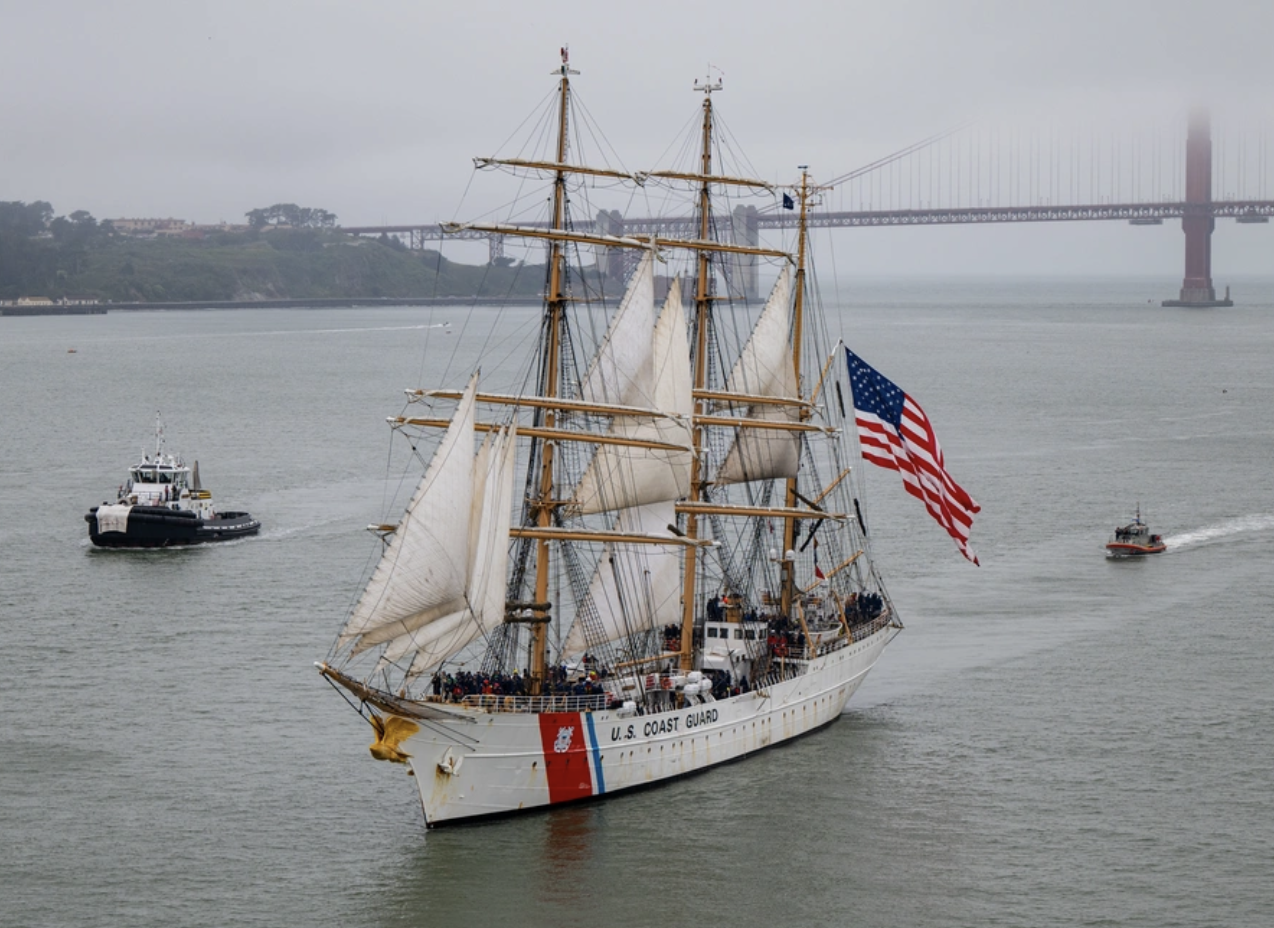 The U.S. Coast Guard Cutter Barque Eagle (WIX-327) sails under the Golden Gate Bridge into San Francisco Bay, June 25, 2025. The Barque Eagle last visited the San Francisco Bay in 2008. (U.S. Coast Guard photo by Petty Officer 3rd Class Hunter Schnabel)