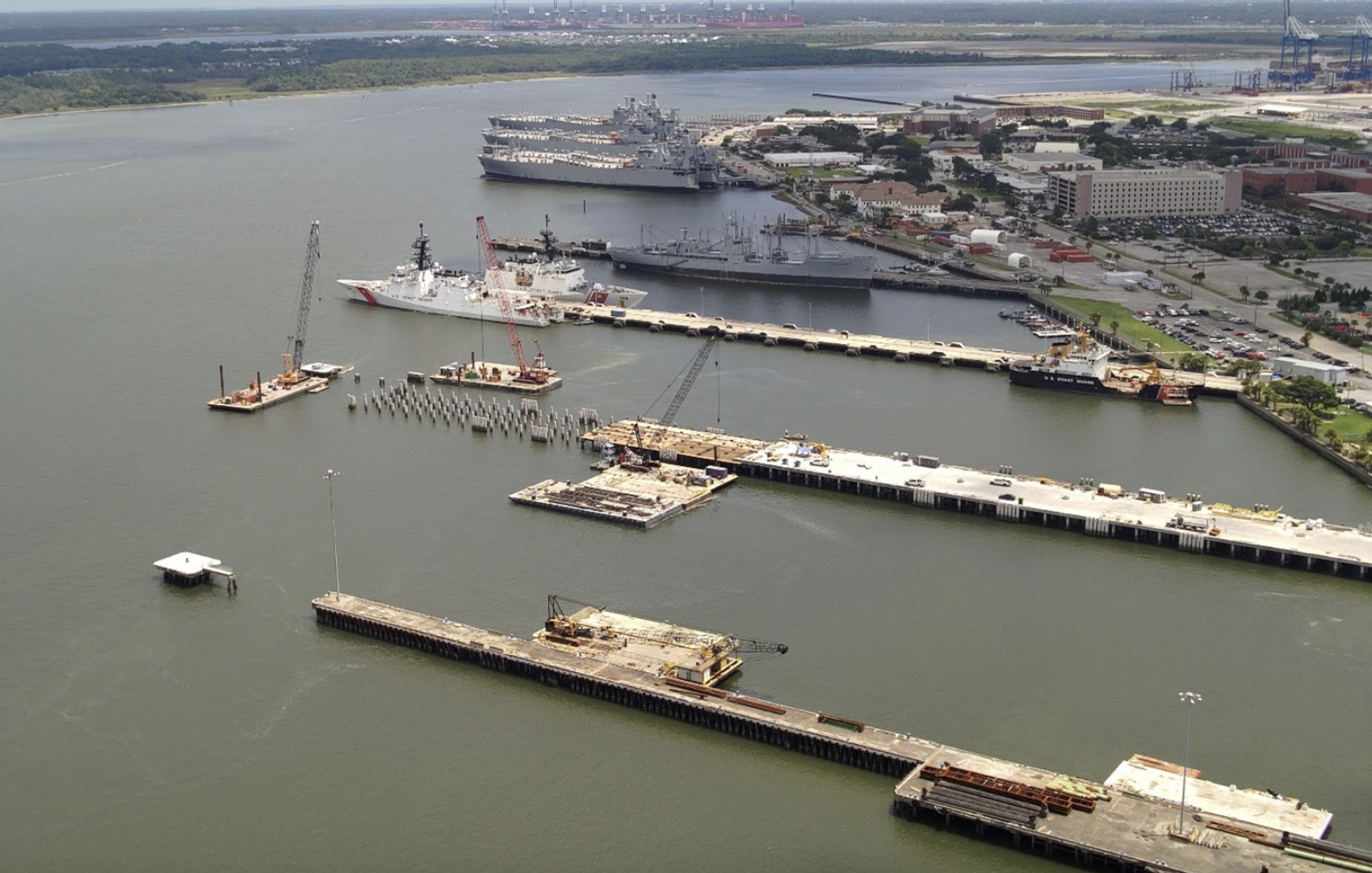 Reconstruction of Pier November (second from the bottom) continues July 23, 2025, at Base Charleston in North Charleston, South Carolina. The Coast Guard used funding made available under the One Big Beautiful Bill Act to modify an existing contract to remove submerged pilings in the vicinity of the piers to facilitate construction of new and modernized facilities to support Coast Guard major cutter operations. U.S. Coast Guard photo.