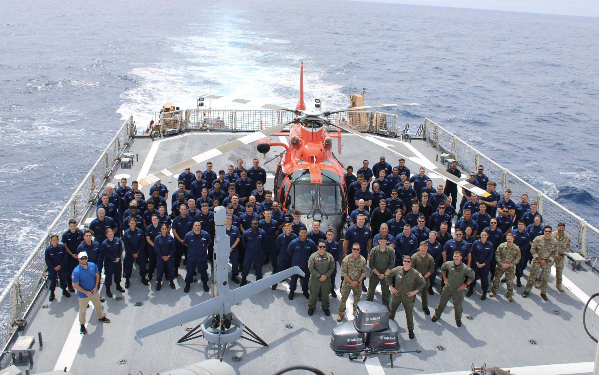Crew members from Coast Guard Cutter Midgett (WMSL 757), the Coast Guard Helicopter Interdiction Tactical Squadron (HITRON), Coast Guard Tactical Law Enforcement Team – South and unmanned aerial vehicle personnel pose for a group photo aboard Midgett while underway in the Eastern Pacific Ocean, Aug. 28, 2025. On Aug. 25, HITRON used airborne use of force to stop the non-compliant vessel, marking the unit’s 1,000th drug interdiction since the unit’s inception in 1999, which resulted in Midgett crew members seizing approximately 3,606 pounds of suspected cocaine worth an estimated $46 million and apprehending six suspected narco-traffickers. (U.S. Coast Guard photo) In the front is a V-Bat Vertical Take Off UAS.