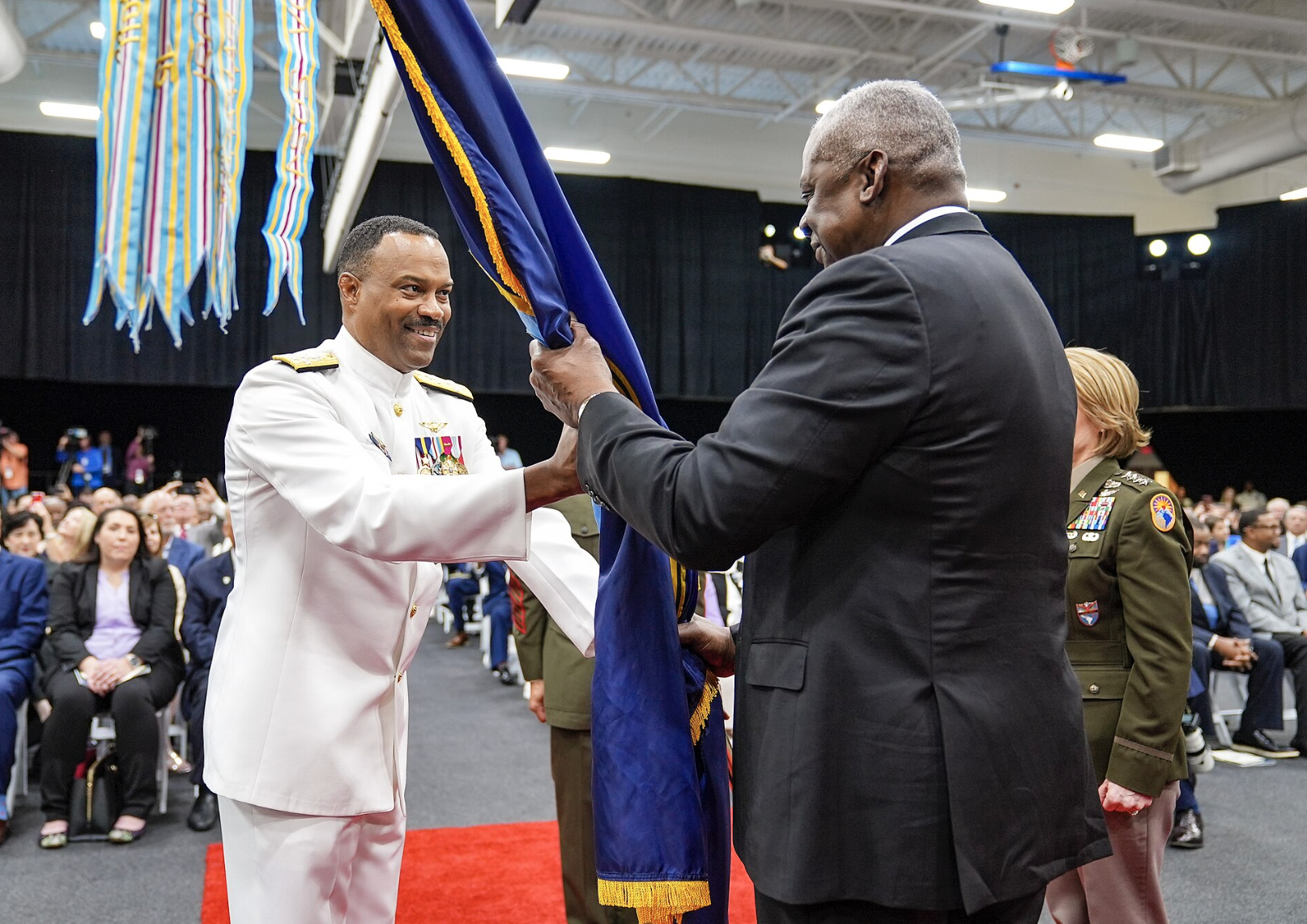 41107-A-BD526-1148 DORAL, Florida (Nov. 7, 2024) Navy Adm. Alvin Holsey, incoming commander of U.S. Southern Command, takes the command guidon from Secretary of Defense Lloyd J. Austin III during the SOUTHCOM change-of-command ceremony in Doral, Florida, Nov. 7, 2024. Holsey assumed command from Army Gen. Laura Richardson, who is retiring after 38 years of service. (Photo by Erica Bechard)