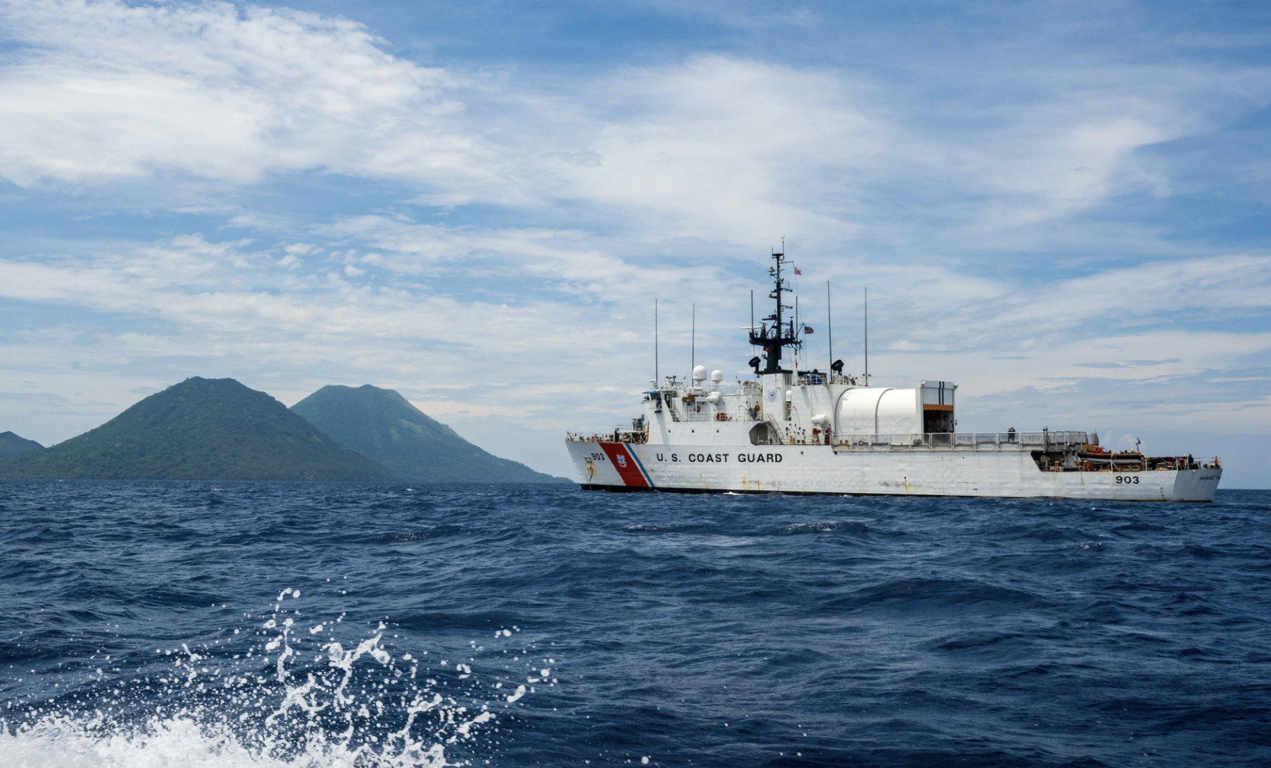 USCGC Harriet Lane (WMEC 903) transits offshore Rabaul, Papua New Guinea, Oct. 26, 2025. Commissioned in 1984, the Harriet Lane is a 270-foot cutter homeported in Honolulu to support Coast Guard missions in the Pacific region. (U.S. Coast Guard Photo by Petty Officer 3rd Class Austin Wiley)