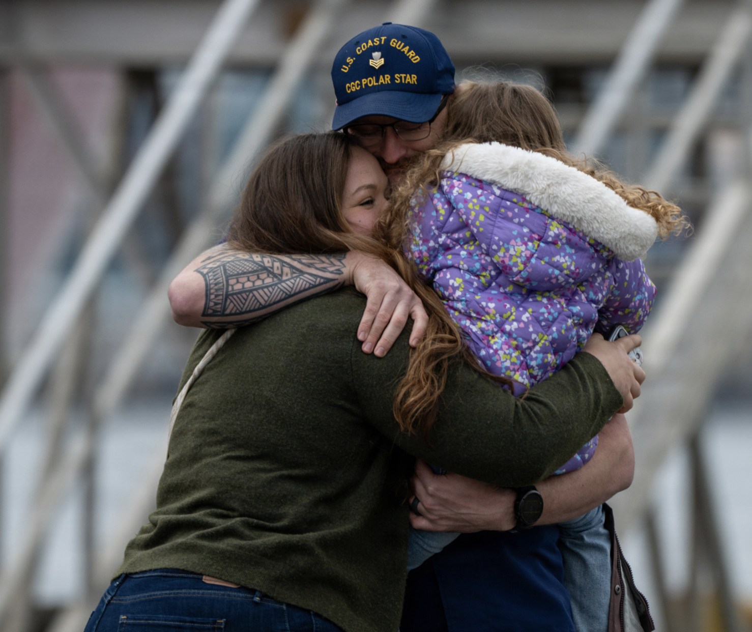 A U.S. Coast Guard Cutter Polar Star (WAGB 10) crewmember reunites with his family at Coast Guard Base Seattle following a 146-day Antarctic deployment in support of Operation Deep Freeze, April 13, 2026. The Polar Star is the United States’ only surface asset capable of providing year-round access to both Polar Regions. It is a 399-foot heavy polar icebreaker commissioned in 1976, weighing 13,500 tons and is 84 feet wide with a 34-foot draft. (U.S. Coast Guard photo by Petty Officer 2nd Class Briana Carter)