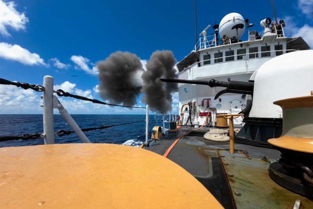 USCGC Mohawk (WMEC 913) conducts a MK-75 gun exercise while underway in the Atlantic Ocean, Sept. 2, 2022. (U.S. Coast Guard photo by Petty Officer 3rd Class Jessica Fontenette)