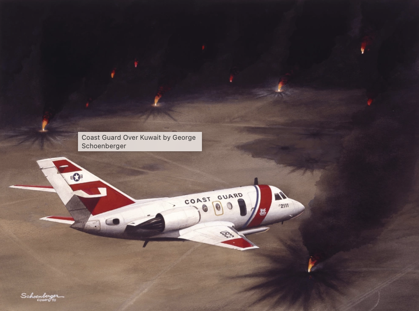 In response to the Iraqi action of firing oil wells and pumping stations in Kuwait, two HU-25A Falcon jets from Air Station Cape Cod, equipped with Aireye technology, which precisely locates and records oil as it floats on water], departed for Saudi Arabia. The Falcons mapped over 40,000 square miles in theatre and located every drop of oil on the water. This was used to produce a daily updated surface analysis of the location, condition and drift projections of the oil. The Aviation Detachment was deployed for 84 days, flew 427 flight hours and maintained an aircraft readiness rate of over 96 percent.
