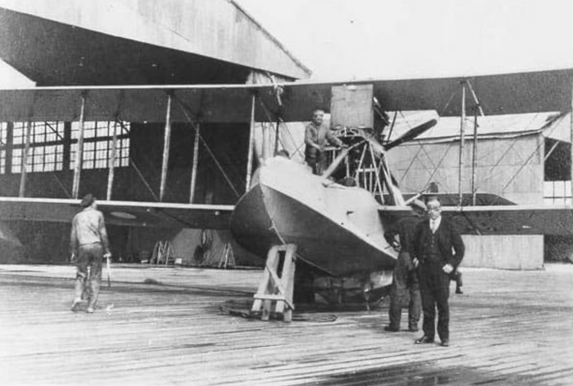 Aircraft maintenance on the ramp at the Morehead City air station. Aircraft was a Curtis HS-2L