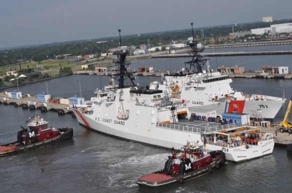 “In October 2015, the North Charleston cutter base was officially commissioned as Coast Guard Base Charleston with new National Security Cutters Hamilton and James replacing the old Gallatin and Dallas. The recently commissioned National Security Cutter Stone has joined its two sister cutters and future plans see the facility becoming a “super base” supporting two more NSCs, as well as units of the new medium-endurance class of Offshore Patrol Cutters and, possibly, one or two new Polar Security Cutters.” (Emphasis applied–Chuck)