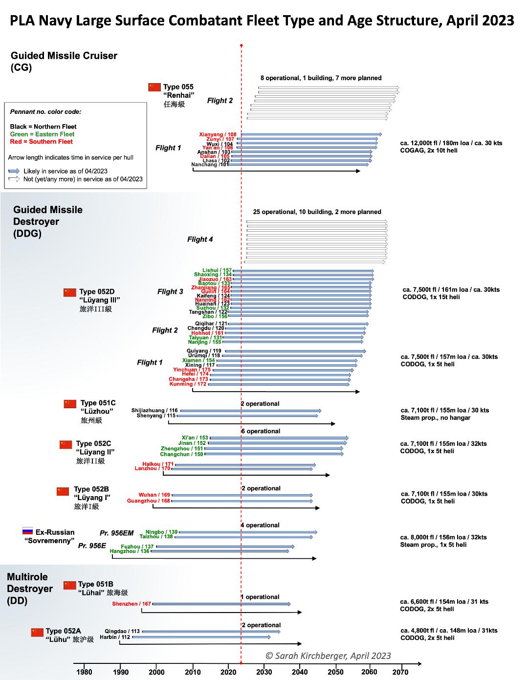 It is interesting to see how the arms embargo since 1989 initially disrupted naval shipbuilding, leading to multiple classes of just one or two hulls being built next to a Russian import, and how mass production finally took off from the Type 052D onward.