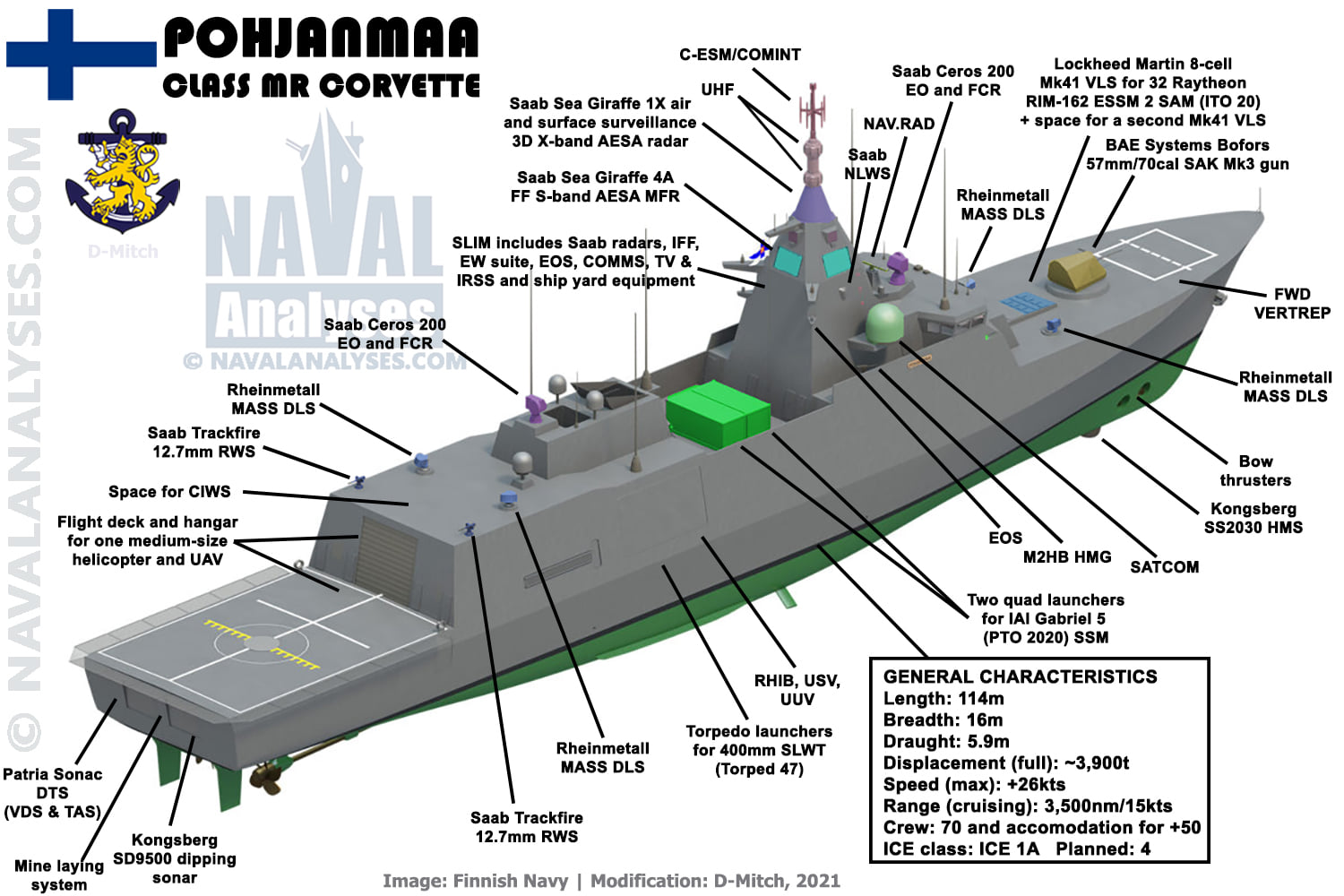 They are to be equipped with two twin launchers for RBS15 Mk3 anti-ship missiles, 8 cells for MBDA VL MICA surface to air missiles, Leonardo OTO Super Rapid 76mm gun, Rheinmetall Millennium 35mm CIWS, and 324mm light weight ASW torpedoes. They will have a SAAB combat management system and a hangar for a Eurocopter AS565MB Panther helicopter, an aircraft that is an evolution of the H-65 design.