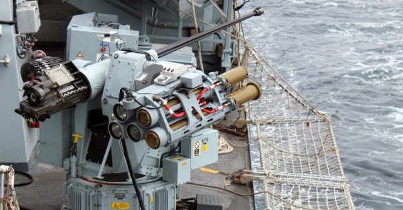 Powerful shipboard firefighting monitors can operate with flow rates in the vicinity of 16,000 gallons per minute, generating nozzle pressures and forces capable of knocking down or destroying drones with seawater. SHUTTERSTOCK