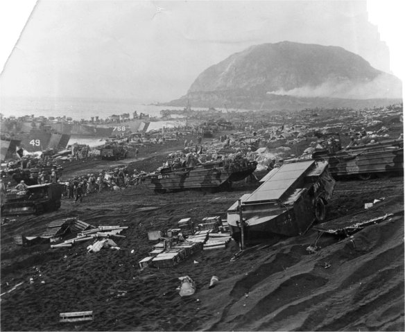 USS LSM-49 and USS LST-758 beached at Iwo Jima during the campaign to capture the island in February 1945. Photo Credit: Sandy Molenda for his father LT. Felix J. Molenda, USCG, Commanding Officer USS LST-758