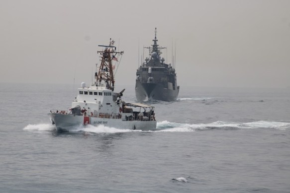ARABIAN GULF (Feb. 25, 2021) The U.S. Coast Guard cutter USCGC Maui (WPB 1304) and the Greek navy guided-missile frigate HS Hydra (F452) participate in a passing exercise in the Arabian Gulf, Feb. 25, 2021. U.S. Coast Guard Patrol Forces Southwest Asia (PATFORSWA) is comprised of six 110-foot cutters, the Maritime Engagement Team, shore-side support personnel, and is the Coast Guard’s largest unit outside of the U.S. playing a key role in supporting Navy security cooperation, maritime security, and maritime infrastructure protection operations in the U.S. 5th Fleet area of operations. (U.S. Coast Guard photo)
