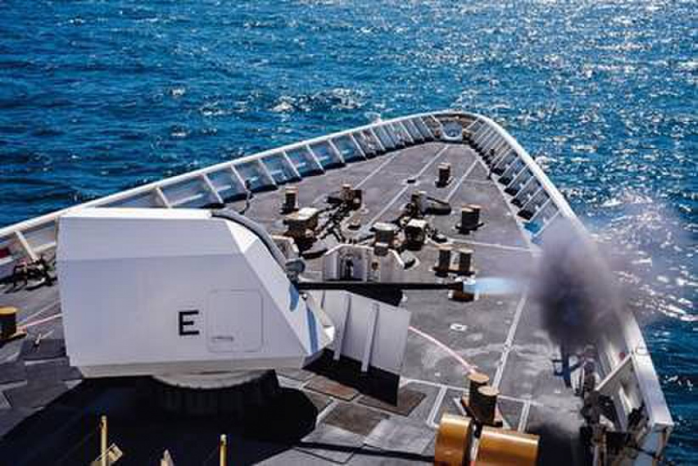 Coast Guard Cutter Stratton fires its MK 110 during a gunnery exercise in the Bering Sea April 28, 2021. Routine training and live-fire exercises provide opportunities to evaluate and improve procedures, test capabilities and maintain proficiency. U.S. Coast Guard photo courtesy Ensign Molly Dolan.