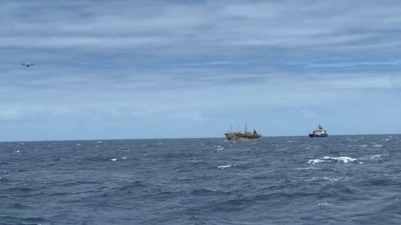 The Coast Guard Cutter Alder approaches a squid fishing vessel while CG-2007, a C-130 from Air Station Barbers Point in Hawaii, flies over (upper left) during Operation Southern Shield 2023, October 2023. The Coast Guard recently completed the first high-seas boardings and inspections off the coast of Peru under a newly adopted multi-lateral agreement to monitor fishing