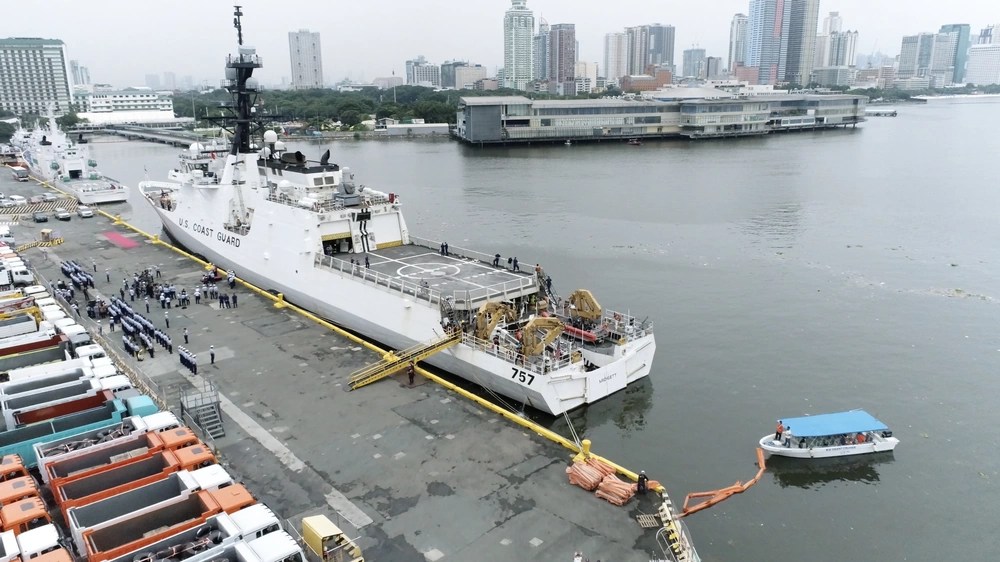 The U.S. Coast Guard Cutter Midgett (WMSL 757) moors in Manila, Philippines, Aug. 30, 2022. Midgett’s crew will engage in professional exchanges and capacity building exercises with the Philippine Coast Guard, and partner nations, and will patrol and conduct operations as directed while deployed on a months-long Western Pacific patrol under the tactical control of Commander, U.S. 7th Fleet. Philippine Coast Guard photo