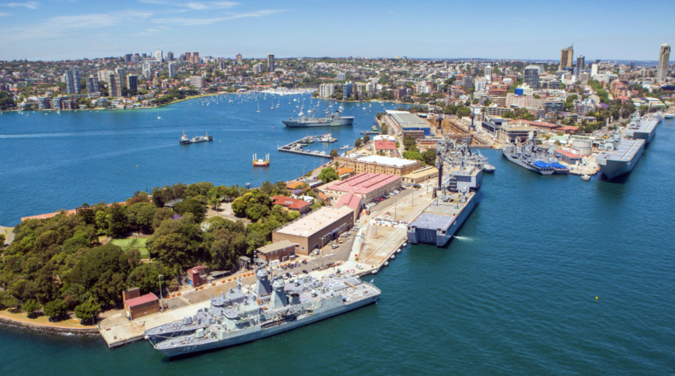 Aerial view of His Majesty’s Australian Station, HMAS Kuttabul. Note the very large dry dock between the island and the city. I was not able to identify all the Australian Navy ships in the photo, but there appear to be eleven Visible in the photo are both Canberra class helicopter dock landing ships (LHD, uppep right); two ANZAC class frigates (FFG, foreground), HMAS Choules (L100, center fight). The photo was probably taken between 2015 and 2018–the ship anchored in the center appears to be HMAS Tobruk which was scuttled in 2018.
