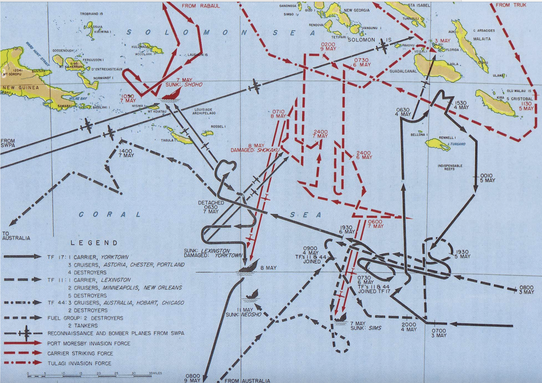 For those with an interest in World War II history. The Battle of the Coral Sea turned back a Japanese force that had planned to attack Port Moresby on the East end of New Guinea.