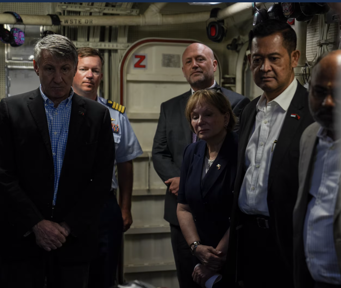 Officials from multiple agencies stand in the engine control room of the Coast Guard Cutter Midgett (WMSL 757) in Papua New Guinea Mar. 6, 2025. Papua New Guinea lies in the heart of key shipping routes, where freedom of navigation for the transport of global goods and fisheries and deep-sea resources abounds. The Coast Guard and Papua New Guinea collaborate to mitigate shared maritime challenges and threats, promoting regional security and stability within Oceania. (U.S. Coast Guard photo by Petty Officer 3rd Class Jennifer Nilson)