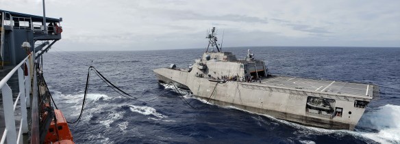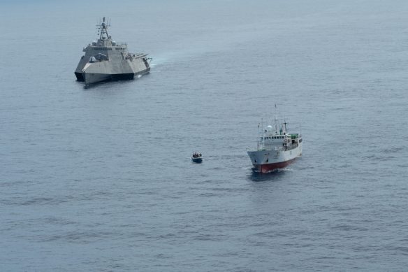 The LCSs are taking part in U.S. Navy and U.S. Coast Guard joint patrol in the Western Pacific under the Oceania Maritime Security Initiative (OMSI) to reduce and eliminate illegal, unregulated, unreported fishing, combat transnational crimes and enhance regional security with the patrol being conducted by Mobile with an embarked Coast Guard law enforcement detachment from the Pacific Tactical Law Enforcement Team. Charleston is currently operating around the Indian Ocean while Oakland is around the South China Sea.”