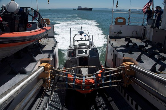 U.S. Coast Guard long range interceptor (LRI) coming aboard into the notch at the stern of U.S. Coast Guard Cutter USCGC Bertholf (WMSL-750). 12 August 2009. U.S. Coast Guard Photo ID 090812-G-3421D_212_LRI, by PO2 Jetta H. Disco