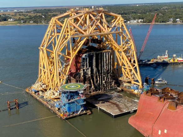 The Golden Ray wreck removal is an amazing piece of salvage work, with a strong dose of Environmental Protection, as they cut the hull into sections and haul it away. You can get updates here. I have posted some of the latest photos below to provide a taste of the magnitude of the work.