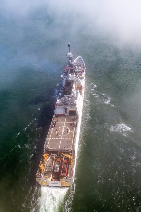 “Coast Guard Cutter Hamilton leads the way for cutters Robert Goldman and Charles Moulthrope as they depart Puerto Rico April 1. National security cutter Hamilton is escorting the two fast response cutters (FRCs) across the Atlantic to Rota, Spain. From there, the FRCs will continue to their homeport of Manama, Bahrain.” U.S. Coast Guard photo by Petty Officer 3rd Class Sydney Phoenix.