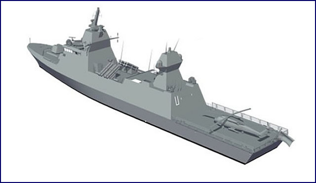 This looks like a straight forward adaptation of one of Damen’s designs for Offshore Industry Support Vessels with boats, helo deck, ESM/ECM, weapons and sensors added.