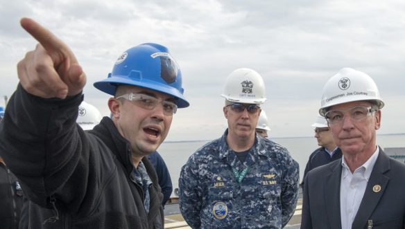 A sailor explains the layout and functionality of Ford’s flight deck to Rep. Joe Courtney in 2016. US Navy Photo