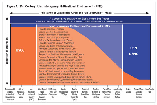 Enhancing regional security in partnership with willing nations requires a 21st-century Great White Fleet of forward deployable (or stationed) national security cutters (NSCs), offshore patrol cutters (OPCs), and fast response cutters (FRC). The mix of platforms and duration of presence would be tailored to the distinct geographies and vary based on the receptiveness of the host nation(s), problem sets to be addressed, and mutual goals of the combatant commands and partner nations. Building on a proven bilateral approach for counterdrug operations and EEZ enforcement, the Great White Fleet would leverage existing agreements—based on the extent to which partner governments are willing—to strengthen CTOC (counter transnational organized crime–chuck) and CT (counter terrorism–Chuck) across the JIME (Joint Interagency Multinational Environment–Chuck).