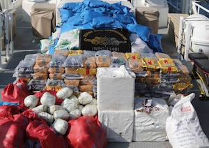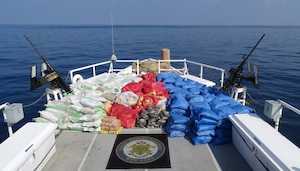 Aboard, the team discovered 261 kilograms of methamphetamines, 2,936 kilograms of hashish, 142 kilograms of heroin and 75,000 pills with the potential to be abused as opium substitutes, with a total estimated street value of more than $21.3 million.
