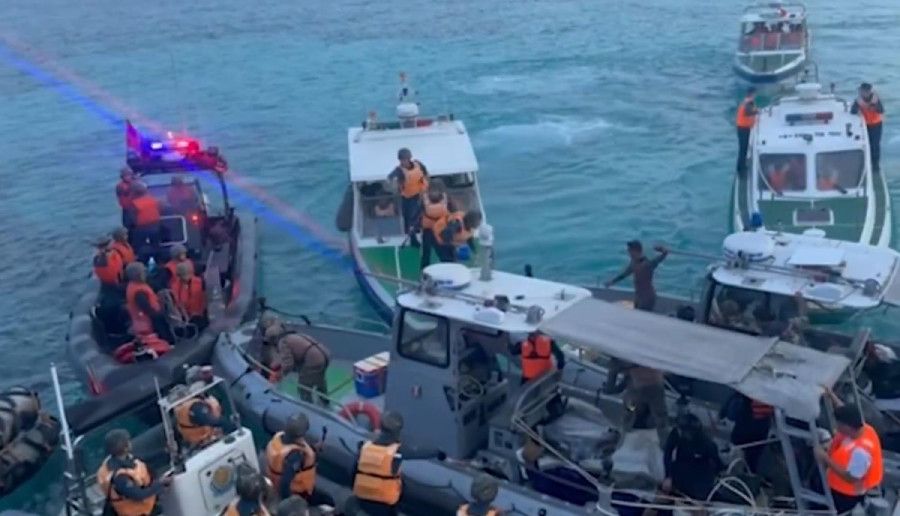 A still image taken from footage released by the Armed Forces of the Philippines showing China Coast Guard personnel confronting a resupply mission (Photo: Armed Forces of the Philippines)