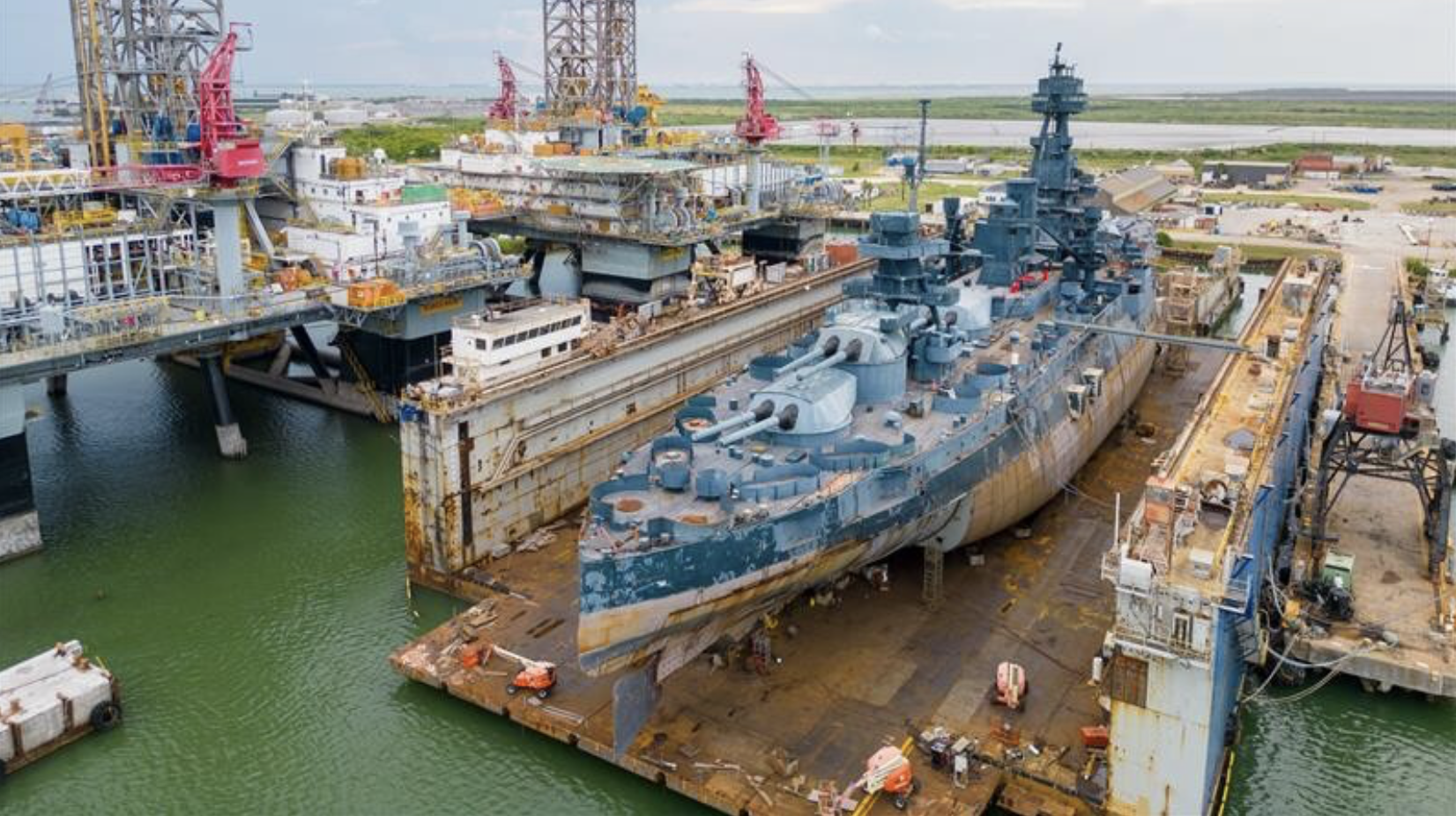 Aerial photo of Gulf Copper Dry Dock and Rig Repair in Galveston, Texas. In the dry dock is the former USS Texas, length 573 ft (175 m) (overall), beam 95 ft 2.5 in (29.020 m), displacement 27,000 tons, so big enough for a Polar Security Cutter. Shutterstock photo by Felix Mizioznikov.