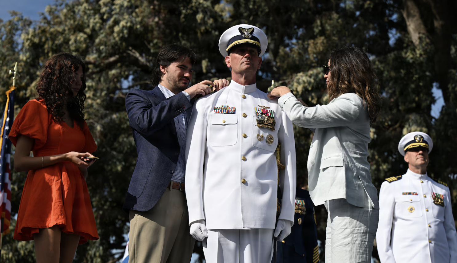 Members of Vice Adm. Joe Buzzella’s family put on his new shoulder boards during his promotion to vice admiral during the Pacific Area assumption of command ceremony in Alameda, California, March 26, 2026. As commander of the Coast Guard Pacific Area and Defense Force West, Buzzella oversees all Coast Guard operations across the Pacific theater- an area encompassing more than 74 million square miles. (U.S. Coast Guard photo by Petty Officer 3rd Class Austin Wiley)