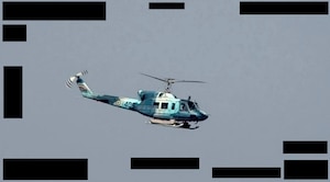 STRAIT OF HORMUZ (Oct. 6, 2023) An undated still image released on Oct. 6 from video taken by an Arabian Fox MAST-13 unmanned surface vessel of an Iranian Navy AB-212 helicopter in the Strait of Hormuz.