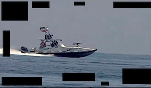STRAIT OF HORMUZ (Oct. 6, 2023) An undated still image released on Oct. 6 from video taken by an Arabian Fox MAST-13 of an Islamic Revolutionary Guard Corps Navy patrol speedboat in the Strait of Hormuz.