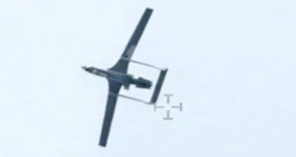 STRAIT OF HORMUZ (Oct. 6, 2023) An undated still image released on Oct. 6 from video taken by an Arabian Fox MAST-13 unmanned surface vessel of an Iranian unmanned aerial vehicle in the Strait of Hormuz.