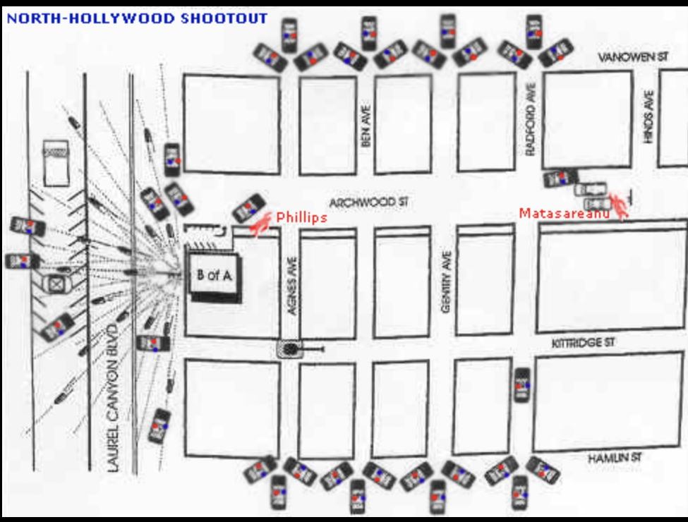 “The North Hollywood shootout, also known as the Battle of North Hollywood, was a confrontation between two heavily armed and armored bank robbers, Larry Phillips Jr. and Emil Mătăsăreanu, and police officers in the North Hollywood neighborhood of Los Angeles on February 28, 1997.