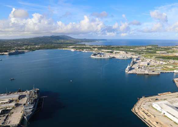 APRA HARBOR, Guam (Aug. 11, 2021) – An aerial view of U.S. Naval Base Guam shows several vessels moored in Apra Harbor, including vessels from the United Kingdom Carrier Strike Group 21, Aug. 9. The deployment is the U.K.’s first by a carrier strike group in the Indo-Pacific for almost 25 years and marks a historic achievement in the bilateral partnership between the U.S. and U.K. The Arleigh Burke-class guided missile destroyer, USS The Sullivans (DDG-68) is deployed with the strike group, as are F-35B Lightning II Joint Strike Fighters of Marine Fighter Attack Squadron 211, HMS Queen Elizabeth (R08), HMS Kent (F78), HMS Defender (D63), RFA Fort Victoria (A387), RFA Tidespring (A136), Royal Netherlands Navy frigate HNLMS Evertsen (F805). French Ship Dupuy de Lome (A759), USNS Rappahannock (T-AO 204), USNS Salvor (T-ARS 52), USS Jackson (LCS 6), USS America (LHA 6), along with the 31st Marine Expeditionary Unit (MEU), were also in Guam for a scheduled port visit. (U.S. Navy photo by Mass Communication Specialist 3rd Class Naomi Johnson)