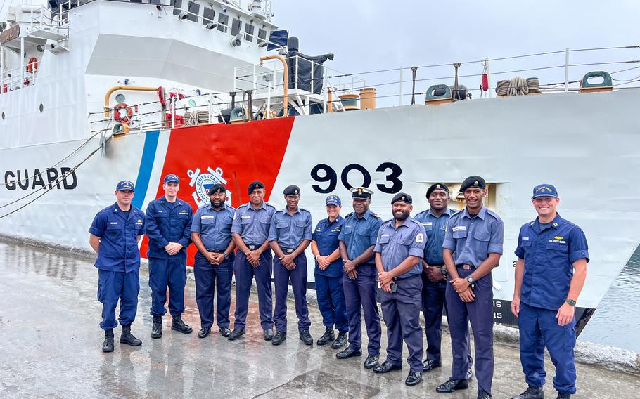 U.S. Coast Guard and Fiji Navy personnel stand in front of the U.S. Coast Guard Cutter Harriet Lane while moored in Suva, Fiji, Feb. 19, 2024. (Charly Tautfest/U.S. Coast Guard)