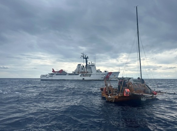 The USCGC Active (WMEC 618) crew rescue a solo sailor stranded on a disabled vessel in the Eastern Pacific Ocean near the Galapagos Islands, Apr. 13, 2024. Active’s crew diverted over 200 nautical miles at high speed to conduct the search and rescue operation for the sailor whose sailboat was disabled and adrift at sea after a pod of whales damaged the boat. U.S. Coast Guard photo by U.S. Navy Midshipman Caden Dale.