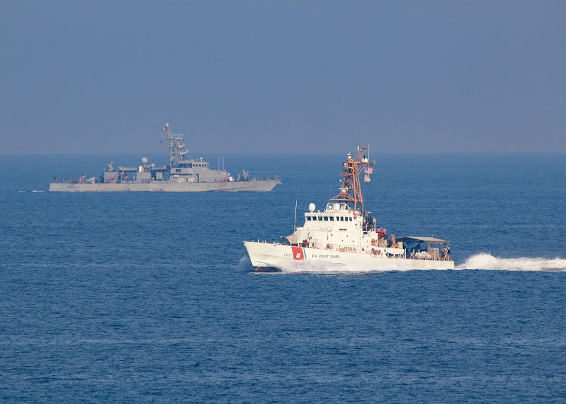 220822-A-KS490-1182 STRAIT OF HORMUZ (Aug. 22, 2022) From the left, U.S. Coast Guard fast response cutters USCGC Glen Harris (WPC 1144), USCGC John Scheuerman (WPC 1146), USCGC Emlen Tunnell (WPC 1145) and USCGC Clarence Sutphin Jr. (WPC 1147) transit the Strait of Hormuz, Aug. 22. The cutters are forward-deployed to U.S. 5th Fleet to help ensure maritime security and stability across the Middle East. (U.S. Army photo by Spc. Noah Martin)